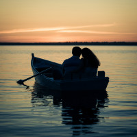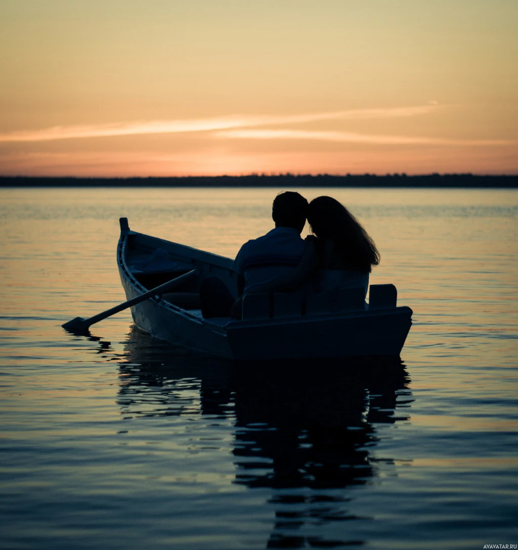The image shows two silhouettes of a man and a woman sitting together in a small boat on