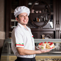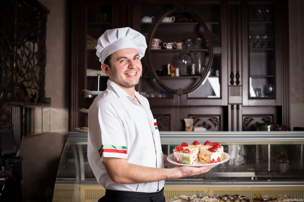 The image shows a man wearing a chef's outfit and hat, standing behind a counter in what appears to be a bakery or