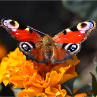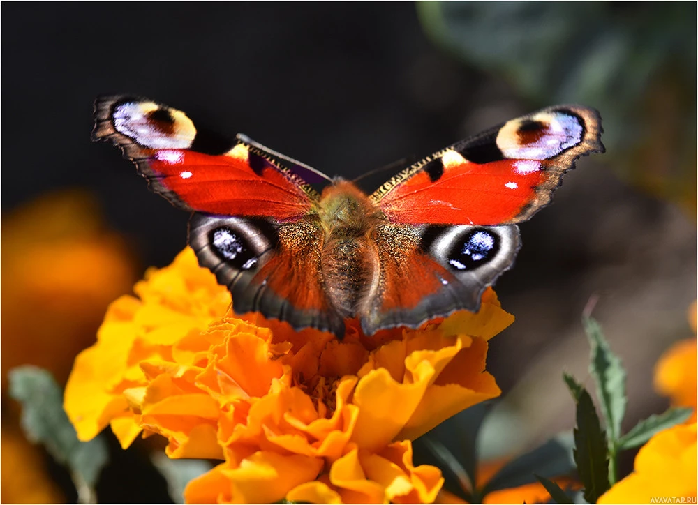 На картинке изображена бабочка, сидящая на ярких желтых цветах. Крылья бабочки украшены узорами красного и черного, что характерно для многих видов, таких как бабочки-монархи или красные леди. На этой картине также изображено насекомое в его естественной среде, взаимодействующее с флорой.