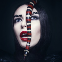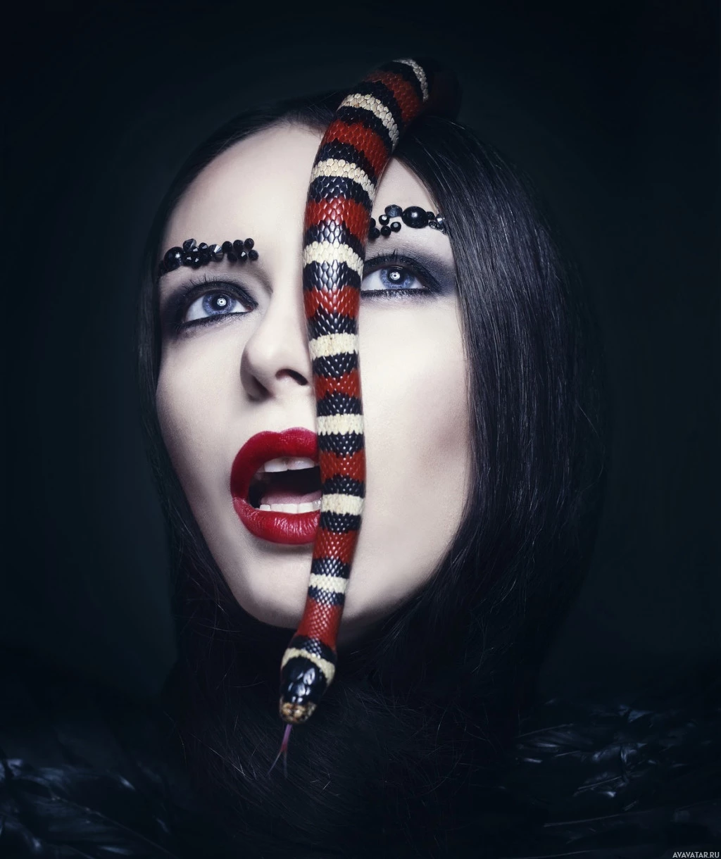 prominent eyelashes which add to her dramatic appearance. The most unusual aspect of the image is the presence of a snake around her neck and head, suggesting some kind of artistic or symbolic expression rather than a literal encounter with