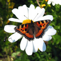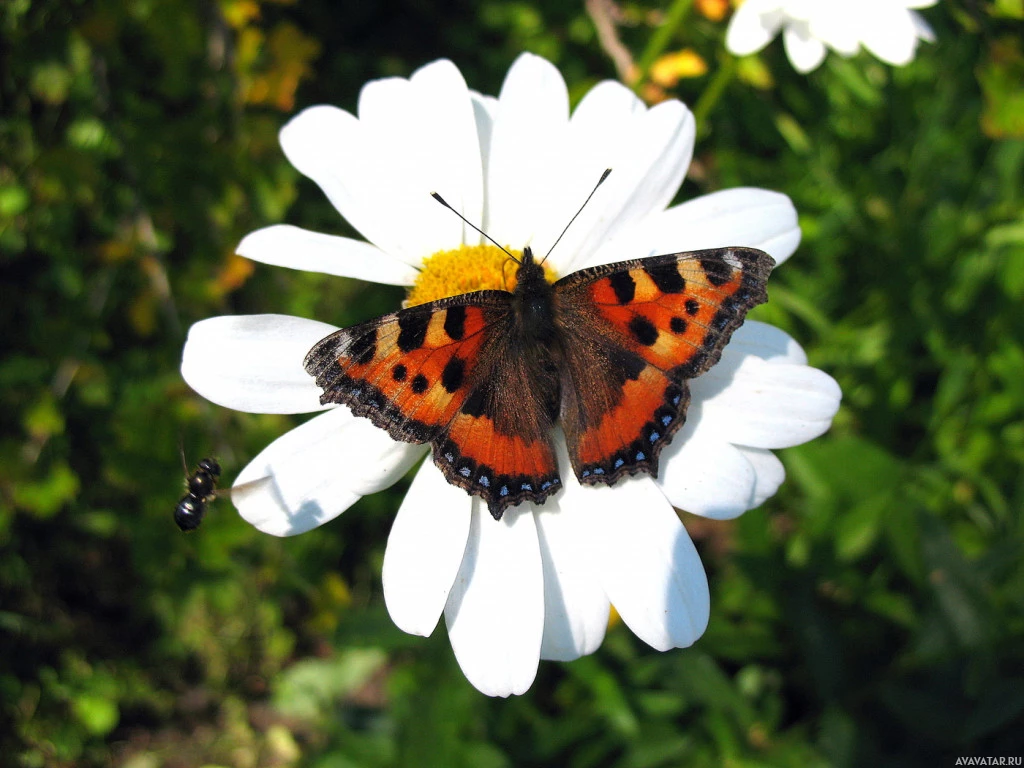 На картинке изображена красивая бабочка с отличительными оранжевыми и черными крыльями, расположенная на белом цветке. На заднем плане находится еще одно небольшое насекомое. Эта сцена показывает взаимодействие между этими двумя различными видами животных в естественной среде.