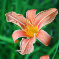 На картинке изображен яркий цветок с лепестками, которые в основном красные и белые, возможно, с некоторыми желтыми изюминками. Это, по-видимому, лилия, широко известная своей трубообразной формой и шестью лепестками. Фон размыт, но предполагает естественную обстановку, такую как сад или поле травы.