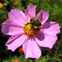 The image features a bumblebee perched on the petals of a pink flower. This scene is likely set in a garden or a natural environment where flowers and bees coexist. The bee, characterized by its distinctive yellow and black striped body, appears to be feeding from or inspecting the flower.