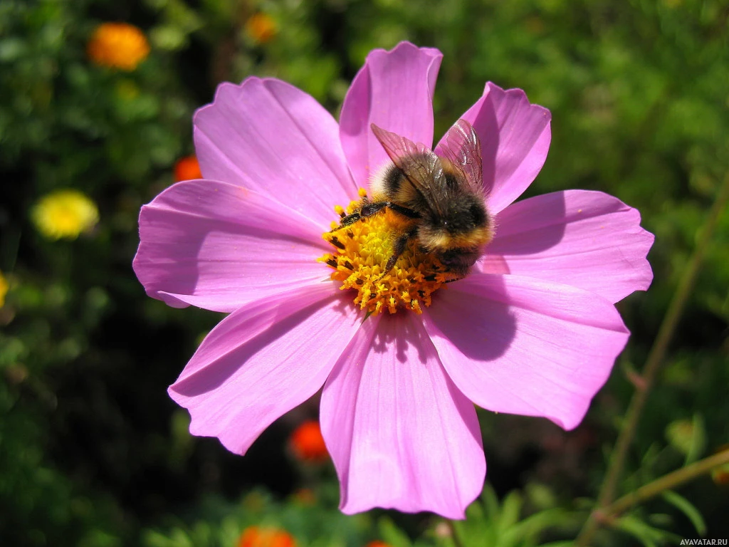 На картинке изображен шмель, сидящий на лепестках розового цветка. Эта сцена, вероятно, происходит в саду или в естественной среде, где сосуществуют цветы и пчелы. Пчела, отличающаяся своим характерным желтым и черным полосатым телом, по-видимому, питается или осматривает цветок.