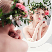 a circular mirror. She is adorned with