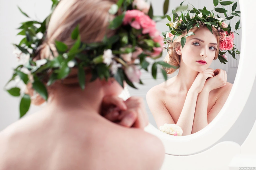 The image features a woman looking at her reflection in