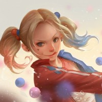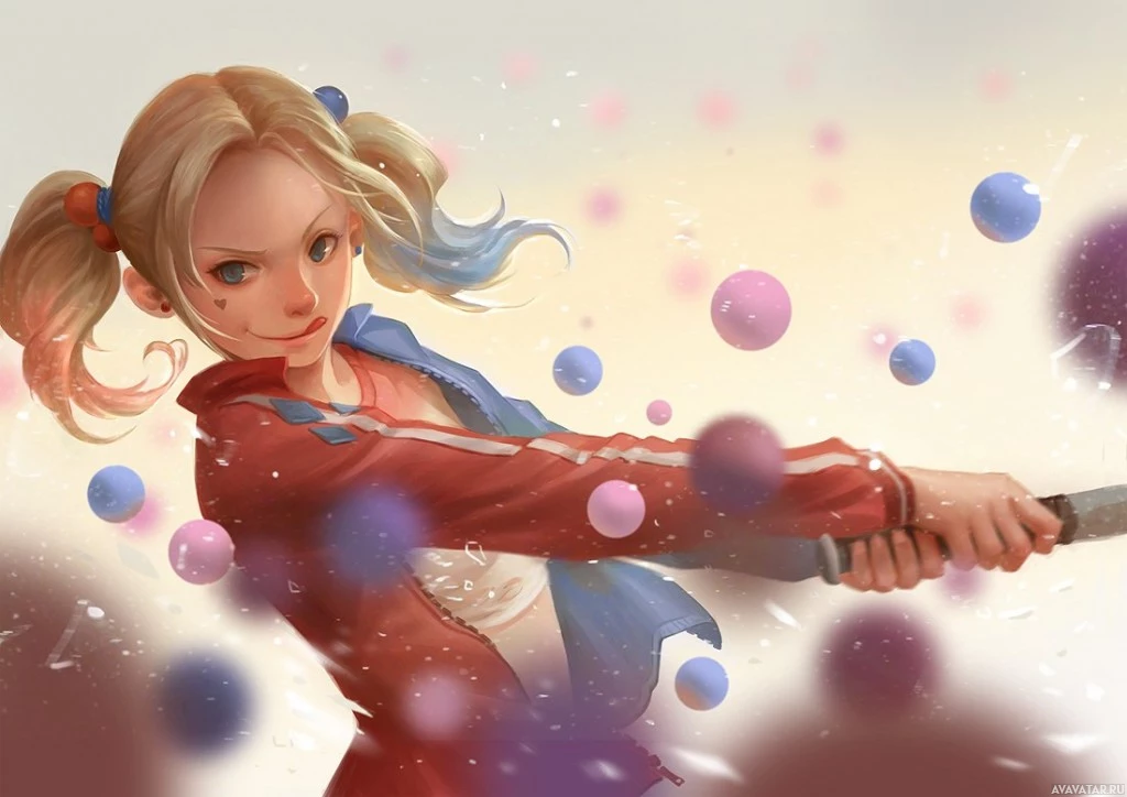spherical objects flying around her, which adds a dynamic element to the scene. The character's design, including the red and blue outfit and the pigtails, is consistent with Harley Quinn's iconic appearance in comics and