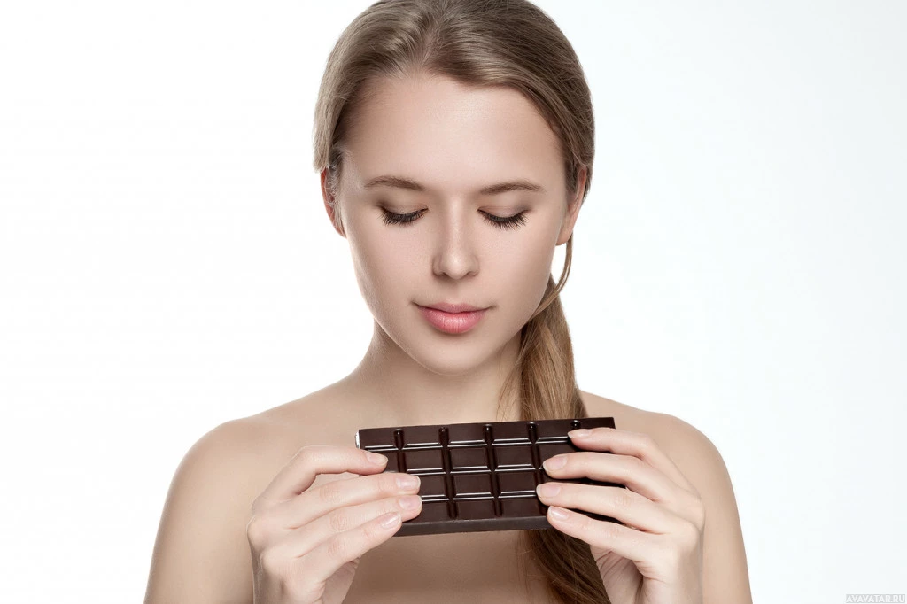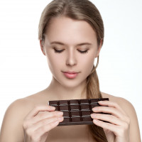 На картинке изображен человек, а именно боковой профиль женщины. Она закрыла глаза и, кажется, держит или осматривает что-то, что является открытой плиткой шоколада. Ее выражение — сосредоточенность или любопытство.