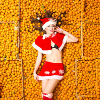 a large display of oranges. The individual is wearing a festive outfit, including a Santa hat and red and white Christmas-themed clothing, suggesting that the photo might have been taken around