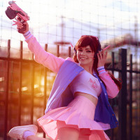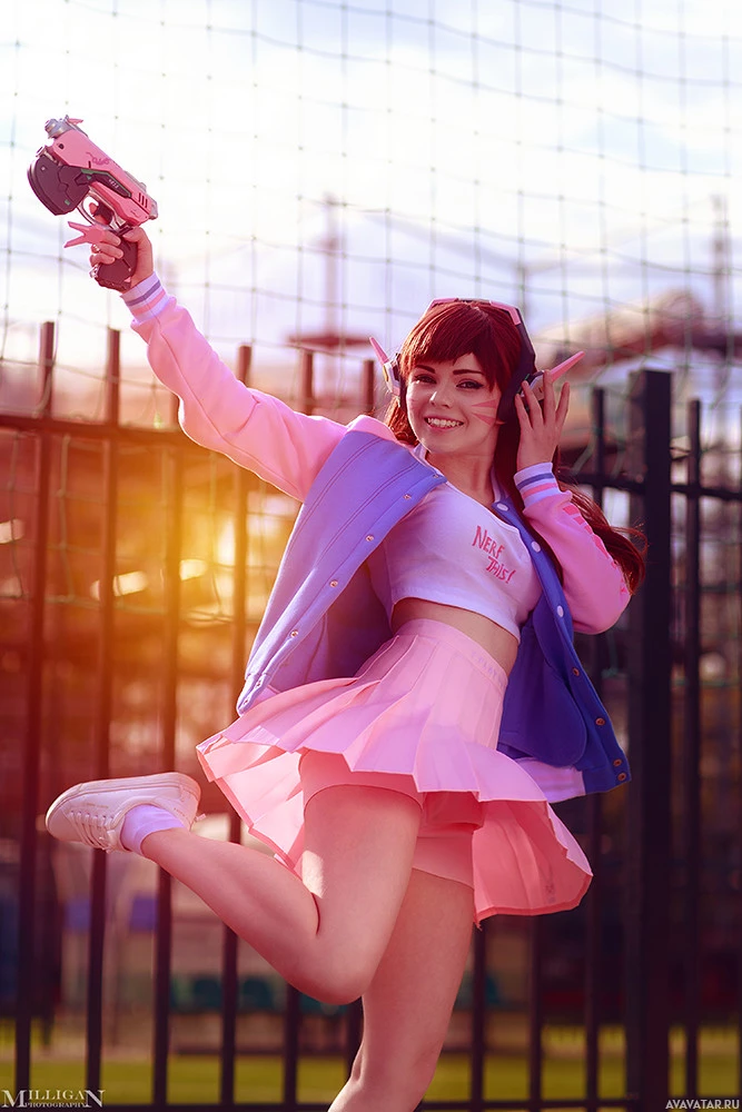 The image shows a person dressed in cosplay, emulating the style of D.Va from the popular