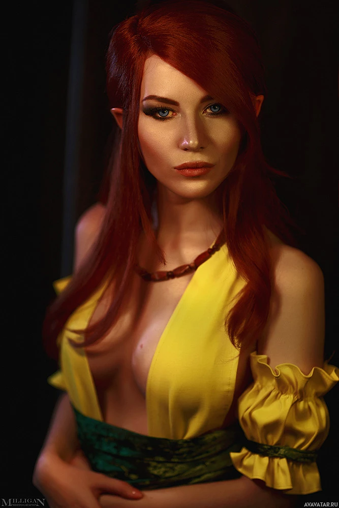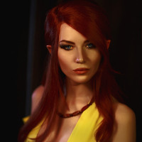 red hair and blue eyes, dressed in what appears to be an elf costume. She is wearing