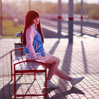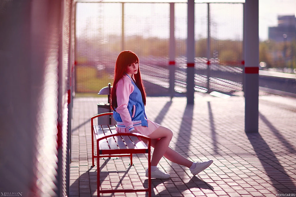 long hair and is wearing what appears to be a cosplay outfit resembling the character D.Va from