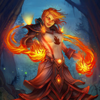 mystical garb that resembles wizard or sorcerer attire, complete with a staff and an elemental symbol on her chest. The staff she holds has fire at its top, indicating perhaps