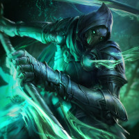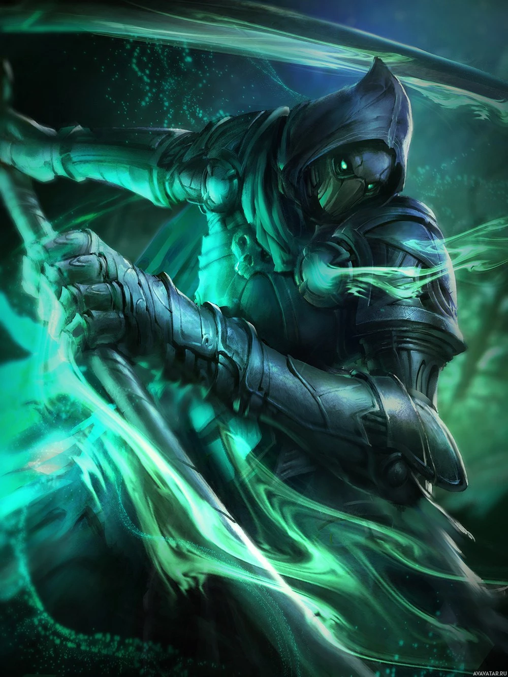 a hooded cloak, adding to the mysterious and stealthy appearance. They are set against a dynamic background with glowing green energy or