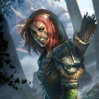Это изображение женского персонажа из видеоигры «Старшие свитки». Персонаж получил имя Aela the Huntress. Она изображена в своем фирменном зеленом и коричневом наряде с колчаном, полным стрел на спине. Место действия кажется лесом или пустыней, что согласуется с ее ролью искусной охотницы.