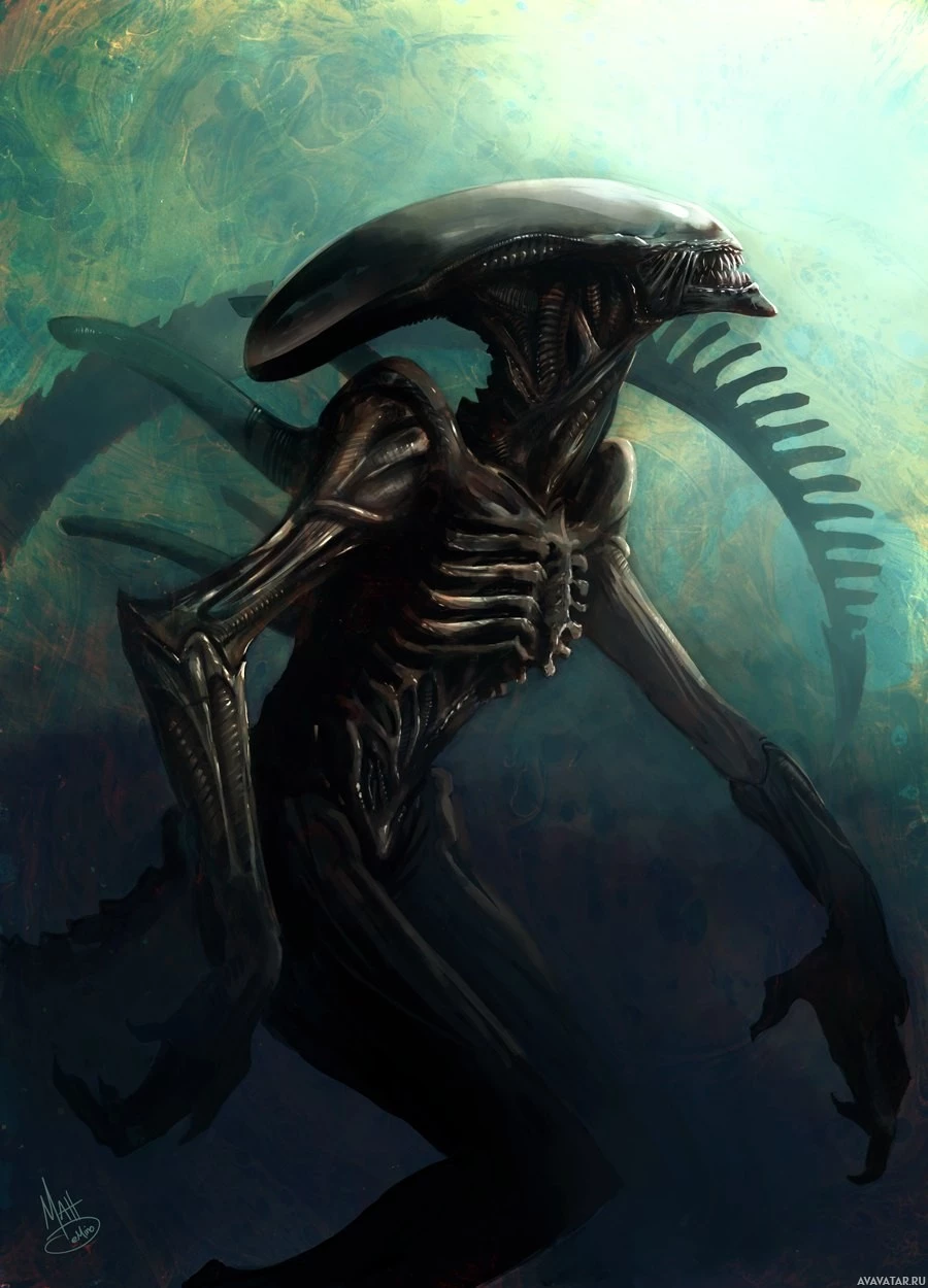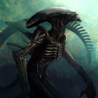 a dynamic pose, likely preparing for battle or in the midst of combat. The Alien is known for its distinctive design with a humanoid shape and a variety of mechanical features such as armored skin, spiky ridges, and two large elongated arms that end in