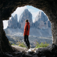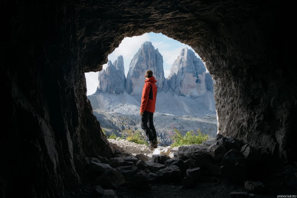 In the picture, there is a person standing inside a cave with an opening that provides a view of the iconic Dolomites