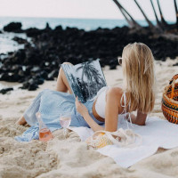 a blonde woman sitting on the sand of a beach. She appears to be relaxing and reading a book or looking at a magazine. The ocean is visible in the background, with