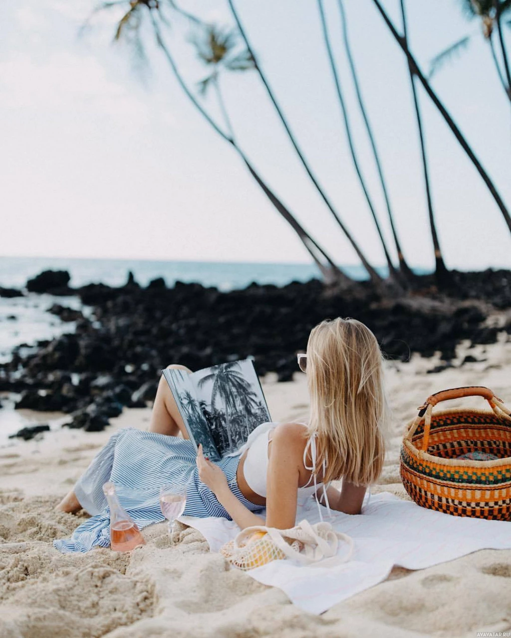 palm trees framing the scene. There is also a handbag next to her, suggesting she has brought some