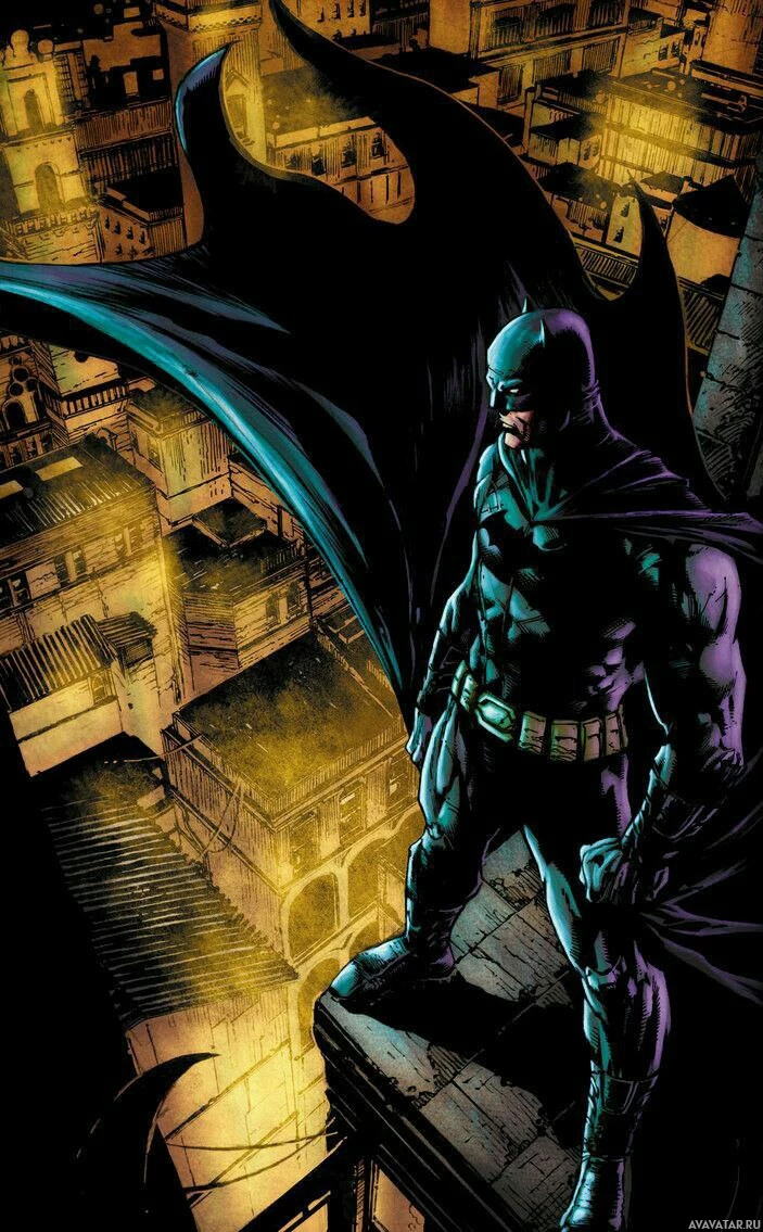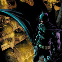 The image depicts a character known as Batman. He is perched on a ledge overlooking a cityscape at night, which suggests an urban environment often associated with the comic