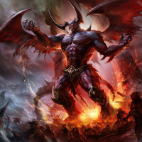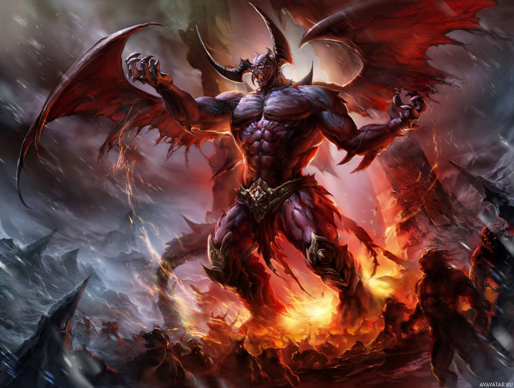 demonic figure with red horns and wings, giving an impression of a powerful and possibly malevolent entity. This figure is standing on what appears to be lava or fire, surrounded by