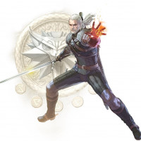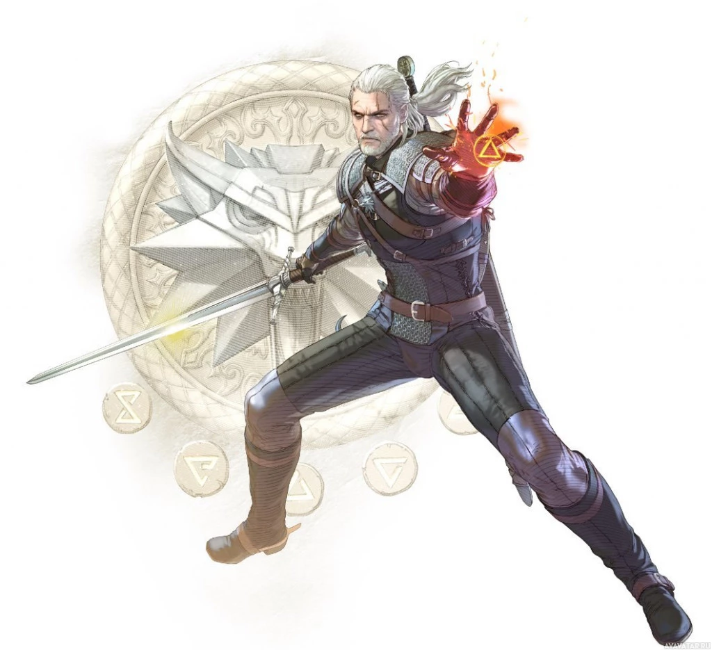 Картинка показывает персонажа Геральта Ривии из серии видеоигр «Ведьмак». Он показан в боевой позиции, с одной рукой, владеющей мечом, а другой рукой, бросающей заклинание огненного шара. На заднем плане — руны и символы, связанные с вымышленной вселенной игр.