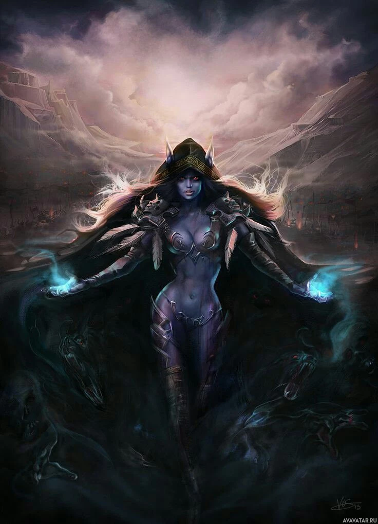 a mystical setting with dramatic clouds and possibly a mountainous landscape, adding to the fantasy aesthetic of the image.
