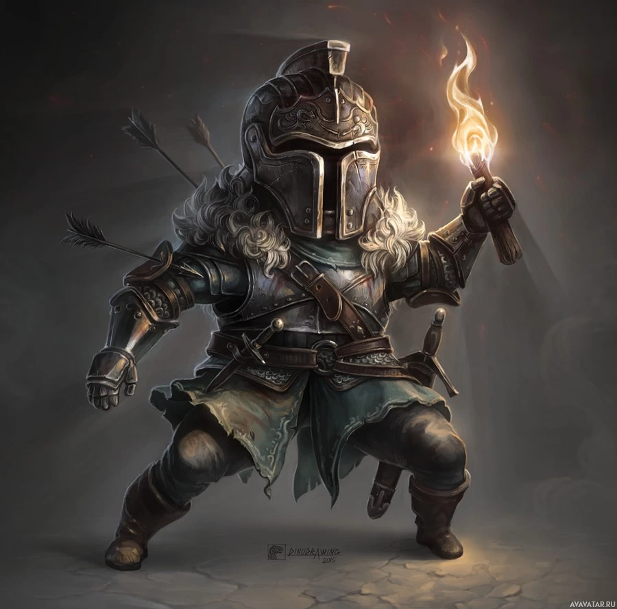 In the image, there is a character that appears to be a warrior or knight. The character is wearing armor and holding what looks like a torch in one hand and possibly a weapon in the other. The setting seems to be dark or shadowy, which could suggest a scene from