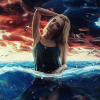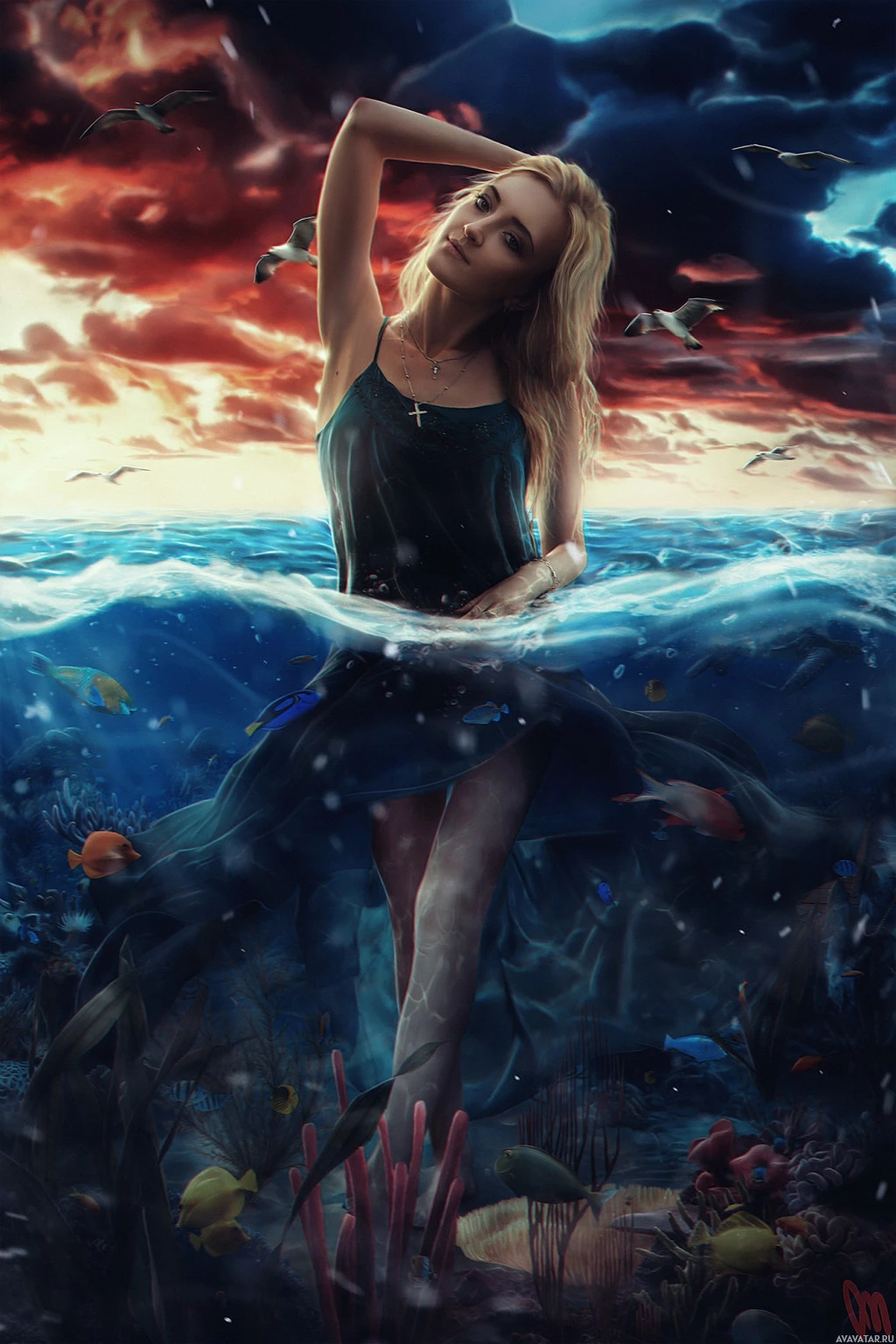 the ocean floor, as if she's just emerged from beneath the waves or is about to dive back into them. Her dress appears to be floating away from her body due to the movement of the water, which adds a sense of