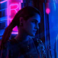 a contemplative expression. Her appearance suggests a cyberpunk or