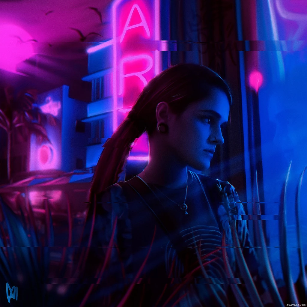 futuristic setting due to the neon lights and urban environment in the background. There are also elements that seem to indicate a digital or virtual overlay on the image, such as the "glitch" effect around her and the distorted lines, which adds to the theme of technology and modernity.