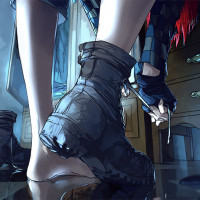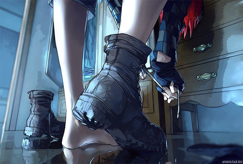 The image shows a close-up of a person's foot wearing a boot with a visible ankle brace. There is also a reflection of the foot and part of a hand holding onto something, which creates