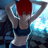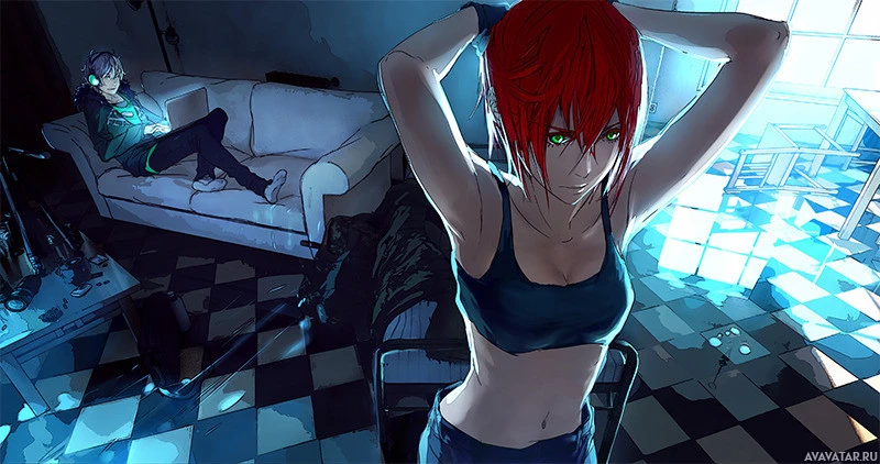 female character with striking red hair. She is posing in a room that appears to be somewhat dilapidated, as suggested by the peeling wallpaper and the dimly