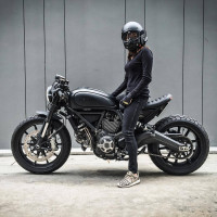 a black motorcycle, wearing a helmet and gloves. The motorcycle appears to be a modern sports bike with