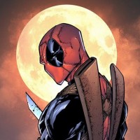 the comic books, Deadpool. He is depicted in his distinctive red and black costume with