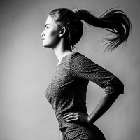The image shows a woman posing with one hand on her hip and the other holding onto what appears to be her hair. She is standing against