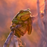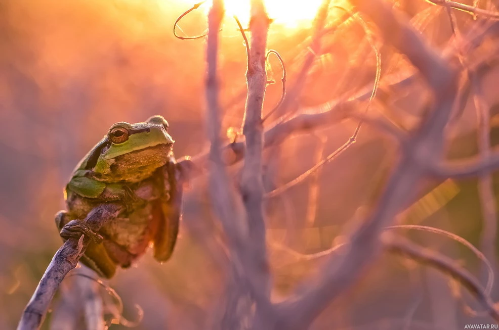 The image shows a frog perched on a twig. It appears to be either sunrise or sunset, given the warm