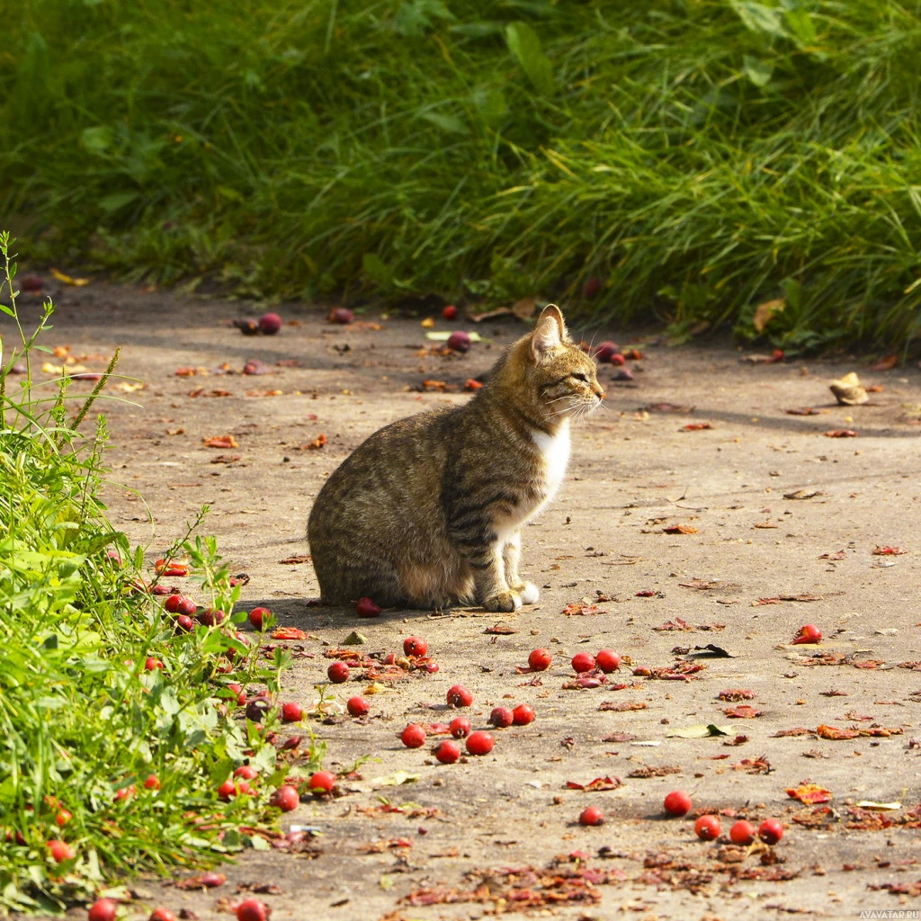 In the picture, there is a cat sitting on what appears to be a sidewalk. The cat is looking to its left and seems to be observing something or waiting for someone. The ground around the cat is scattered with