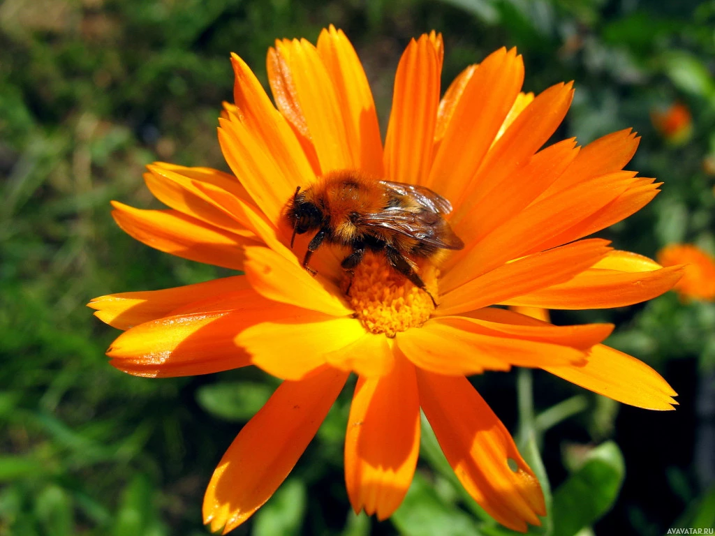 Изображение имеет оранжевый цветок с ярким, ярким цветом и узором лучевых флоретов. В центре цветка находится пчела, которая кажется шмелем, учитывая ее размер и окраску. Фон предполагает наружную обстановку, возможно, сад или природную среду, где растут цветы и привлекают опылителей.