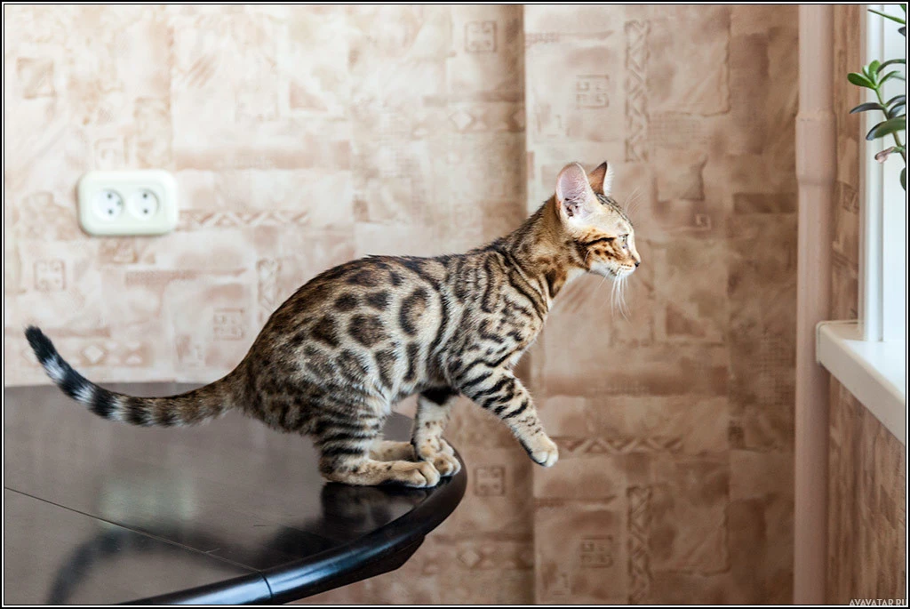 a Bengal cat standing on the edge of a table or countertop. The cat has distinctive
