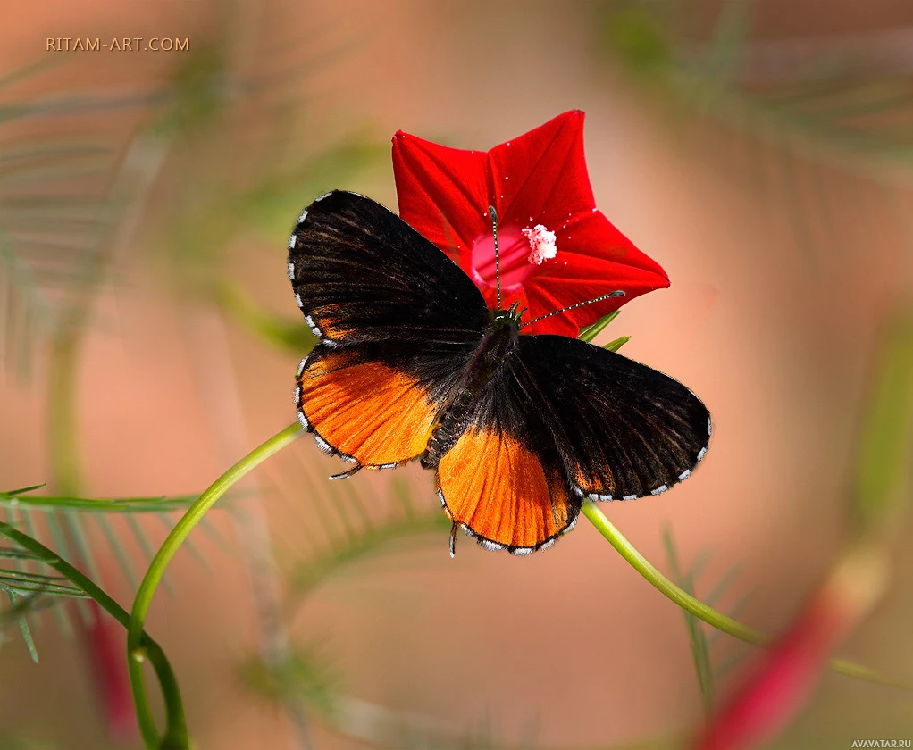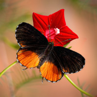 a red flower. This could be considered an example of interspecific interaction, where different species of animals or plants interact with each other in their