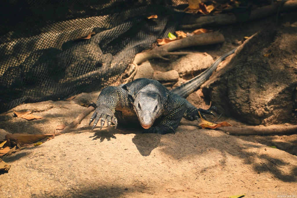 На снимке изображено животное, которое выглядит как ящерица-монитор. Он сидит на клочке грязи или песка, с некоторой растительностью вокруг него и тем, что кажется сеткой или защитным покрытием на заднем плане. Окружающая среда предполагает, что это может быть охраняемый вольер или заповедник дикой природы, предназначенный для сохранения таких видов.