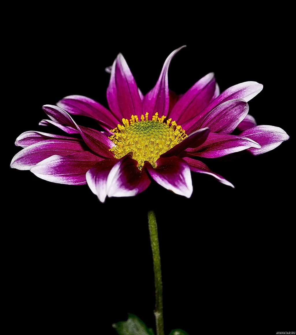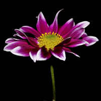 На картинке виден единственный цветок с яркими фиолетовыми лепестками и ярко-желтым центром, что характерно для далия. Похоже, что это фокус фотографии, снятый на нейтральном фоне, который хорошо контрастирует с цветами цветка.