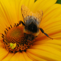 a yellow flower. The flower has small green details and appears to be a type of sunflower or similar plant that attracts bees for
