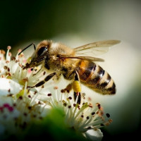 The picture shows a bee, which is an insect. It appears to be on flowers, possibly collecting nectar or pollen for food. The bee is surrounded by green foliage and is captured in a close-up shot that highlights its details.