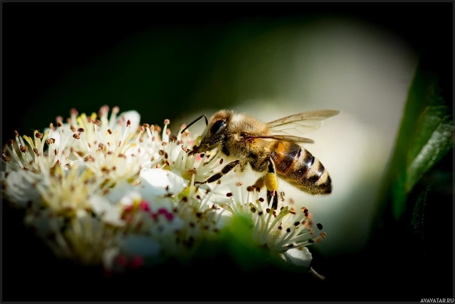 На картинке изображена пчела, которая является насекомым. По-видимому, он находится на цветах, возможно, собирая нектар или пыльцу для еды. Пчела окружена зеленой листвой и запечатлена крупным планом, который подчеркивает ее детали.