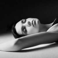 The image shows a woman lying on her back with her eyes closed. She appears to be in a state of relaxation or rest. Her hair is dark, and she has a graceful posture. The setting suggests an indoor environment with soft lighting that casts shadows around her body, creating a serene atmosphere.