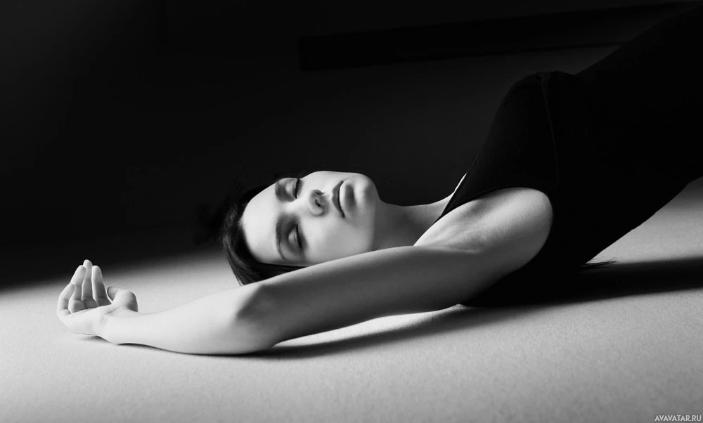 На картинке изображена женщина, лежащая на спине с закрытыми глазами. Она находится в состоянии расслабления или отдыха. Ее волосы темные, и у нее изящная осанка. Обстановка предполагает пребывание в помещении с мягким освещением, которое отбрасывает тени вокруг ее тела, создавая безмятежную атмосферу.