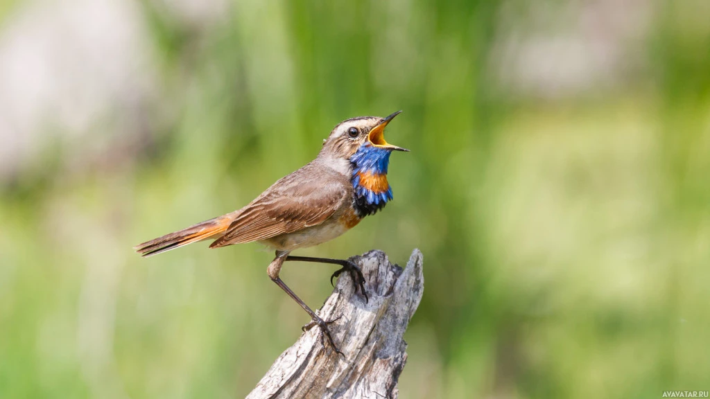 a small bird perched on what appears to be a wooden fence post. The bird has a blue and orange plumage with