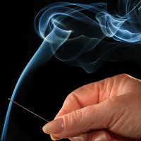 a lit match or lighter, which is producing a trail of smoke. There's also an object that appears to be a small pencil being held by the other hand, possibly for balance or stability during the smoke-